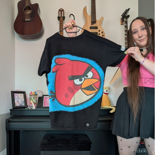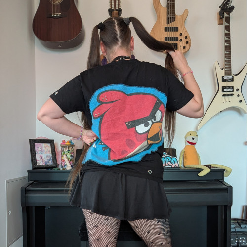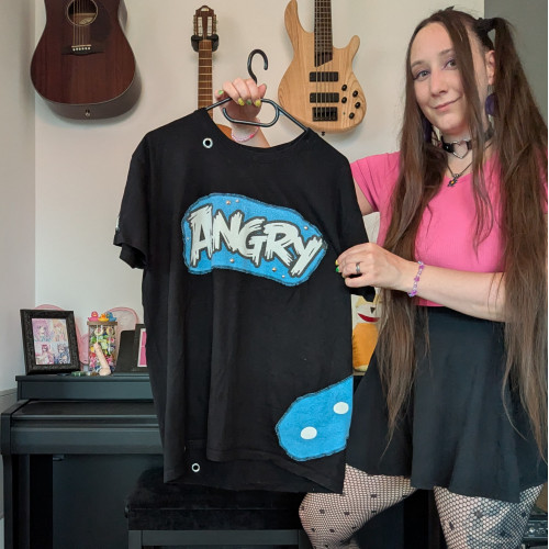 Mit handgemachten Patches aus second-hand Bettwäsche und Nieten.