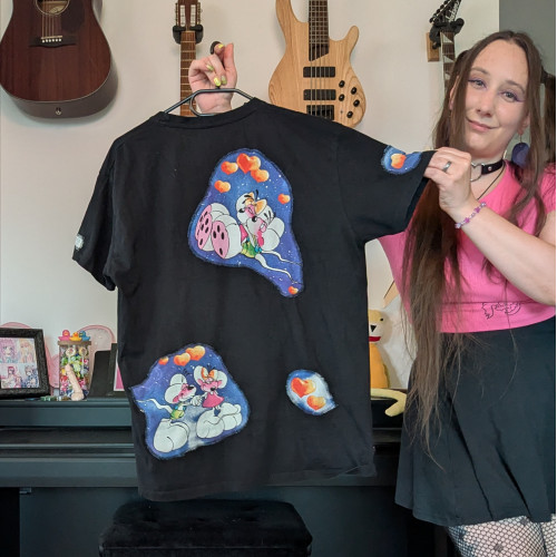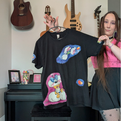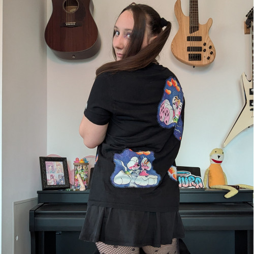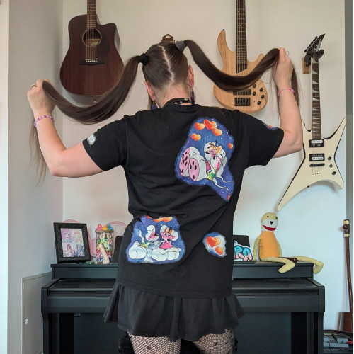 Mit handgemachten Patches aus second-hand Bettwäsche.