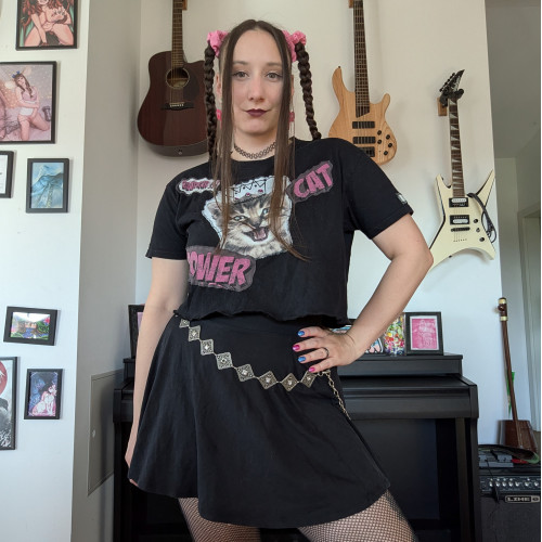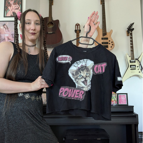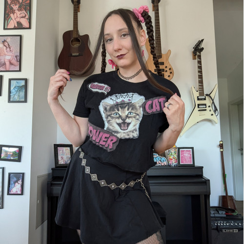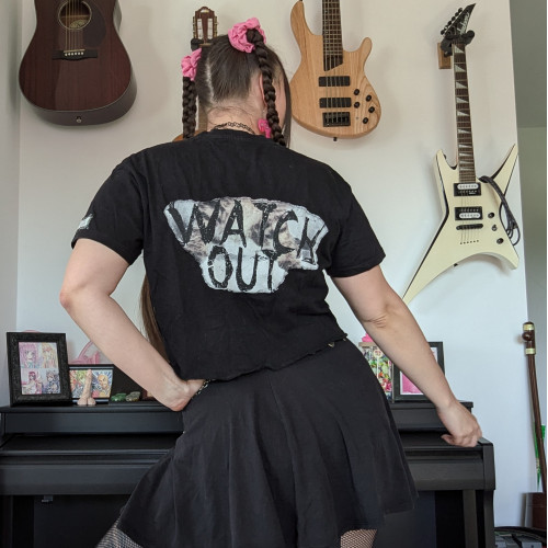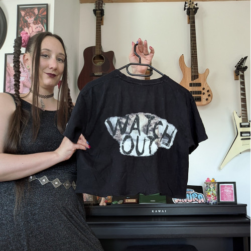 Mit handgemachten Patches aus second-hand Shirts und Nieten.